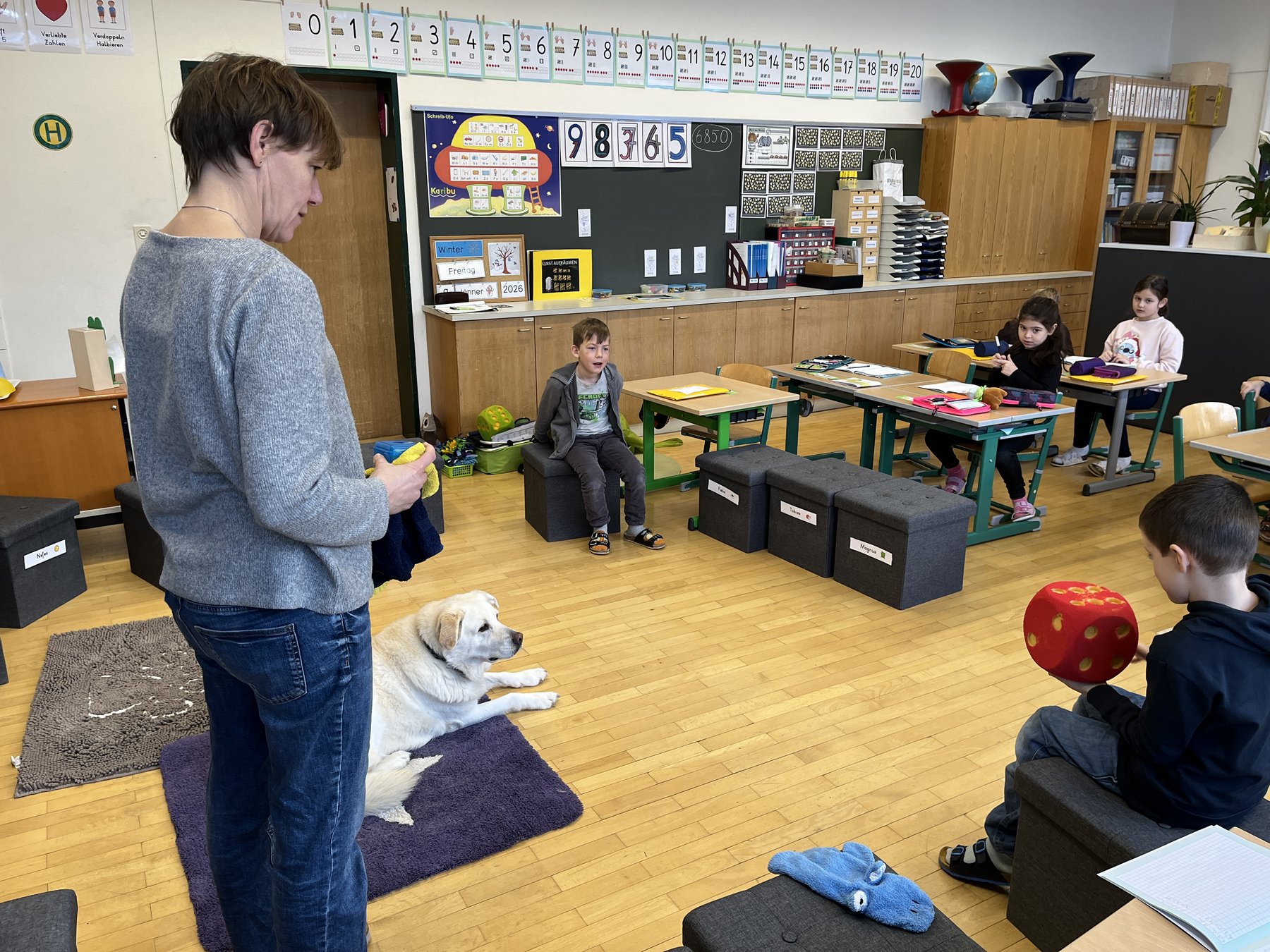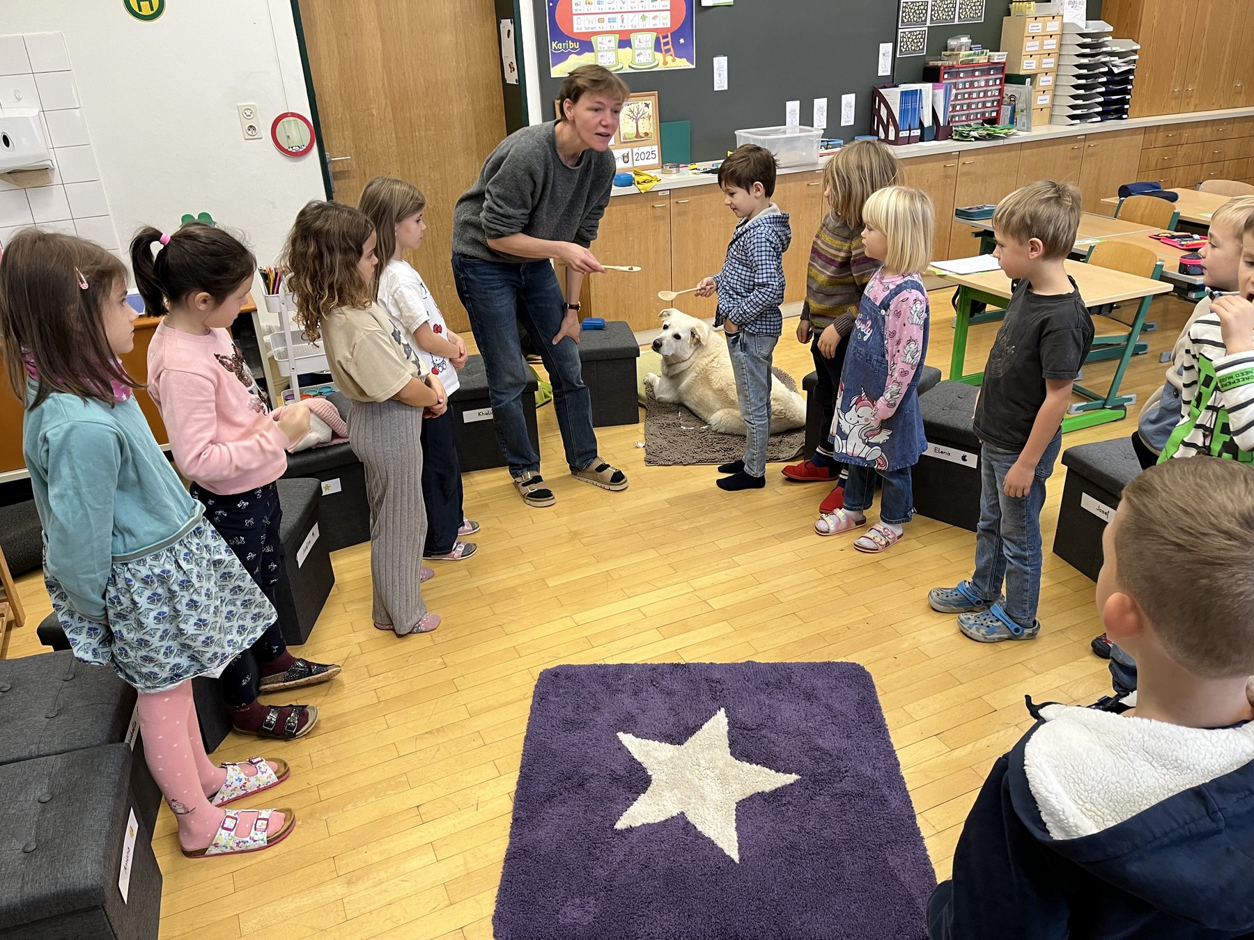 Was ich gerne mache: spazieren, spielen, mit Frau Diem die Klassen besuchen und Leckerlis bekommen